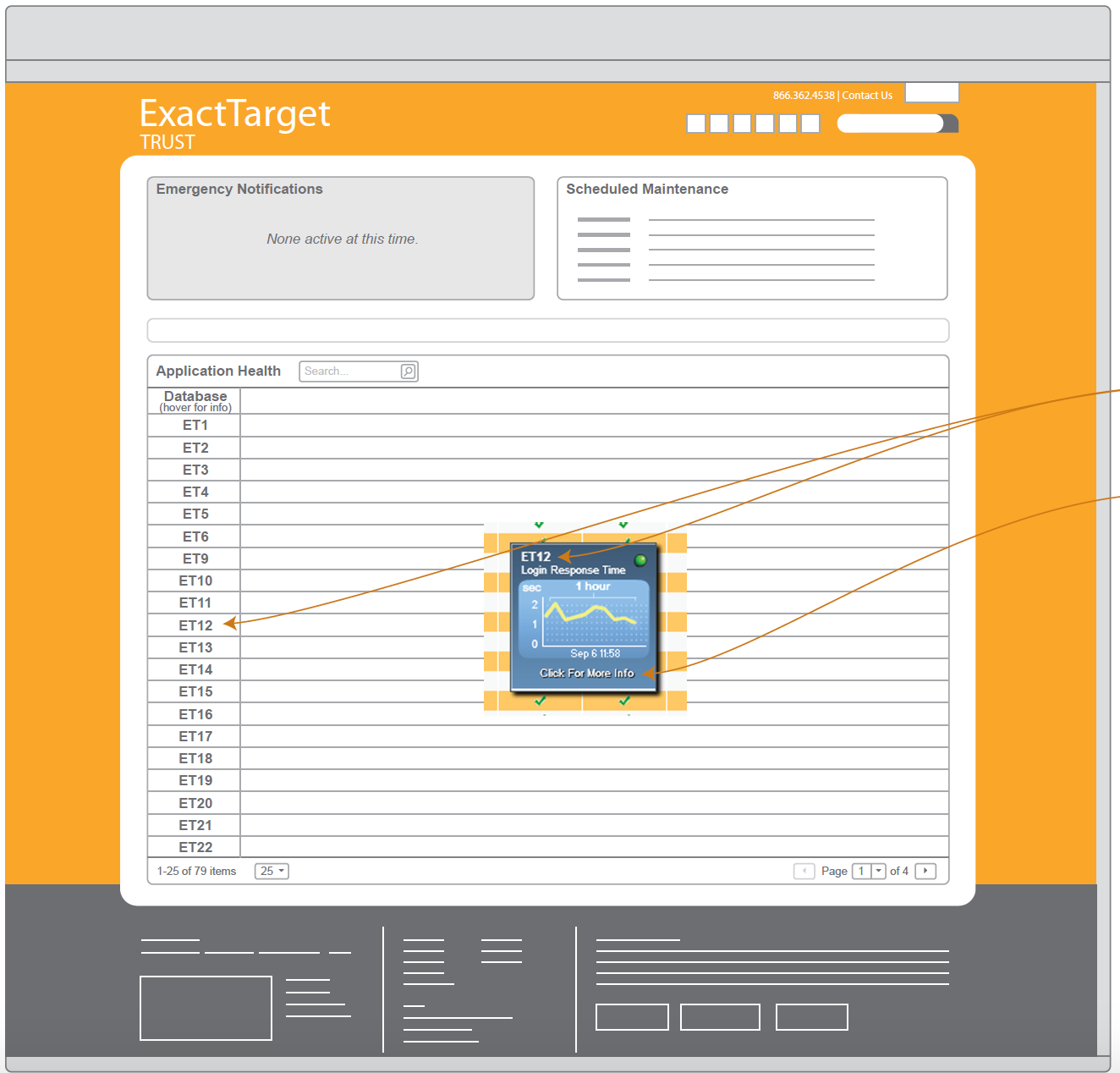 I worked with a UX Researcher, Developer and Product Manager to redesign and launch the ExactTarget Trust Site as a limited beta to get user feedback and then launch GA. The purpose of the current site was intended to help ExactTarget admin users monitor real-time system performance and maintenance windows (primarily DB system down/up times) so they could understand the health of their systems and be better informed.